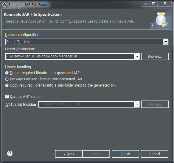 다 설정한 뒤 Finish를 누르면 jar파일이 생성이 됩니다.