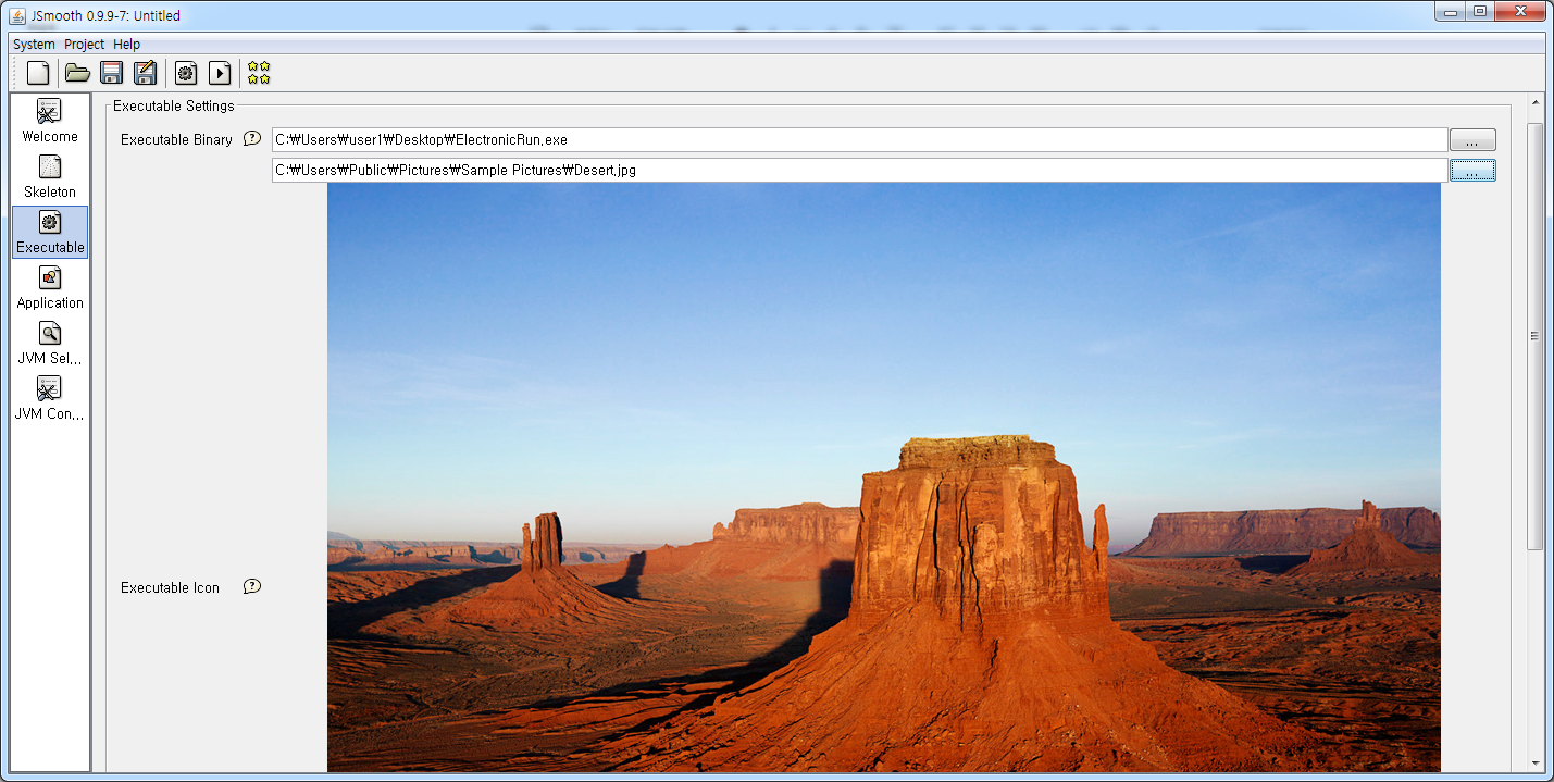jar파일을 생성한 뒤 다시 JSmooth로 넘어와서 왼쪽의 메뉴에서 'Skeleton'을 선택한 뒤 'Skeleton Selection'에서 타입을 설정하면 됩니다. UI가 있을 시(Swing 등) 'Windowed Wrapper'를 선택하면 되고 콘솔로만 실행할 시 'Console Wrapper'를 선택하면 됩니다.