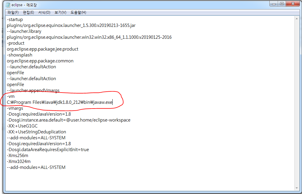 eclipse.ini 구성 설정 파일에 추가 정보를 기입 후 이클립스 재실행 해야한다.