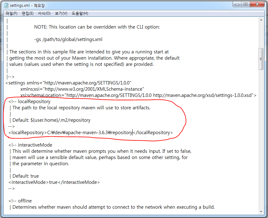 - Settings.xml 파일 수정 -> conf폴더 - settings.xml 파일을 열어 주석 처리된 <localRepository>를 빼내어 위에 생성한 'repository' 폴더의 경로를 작성