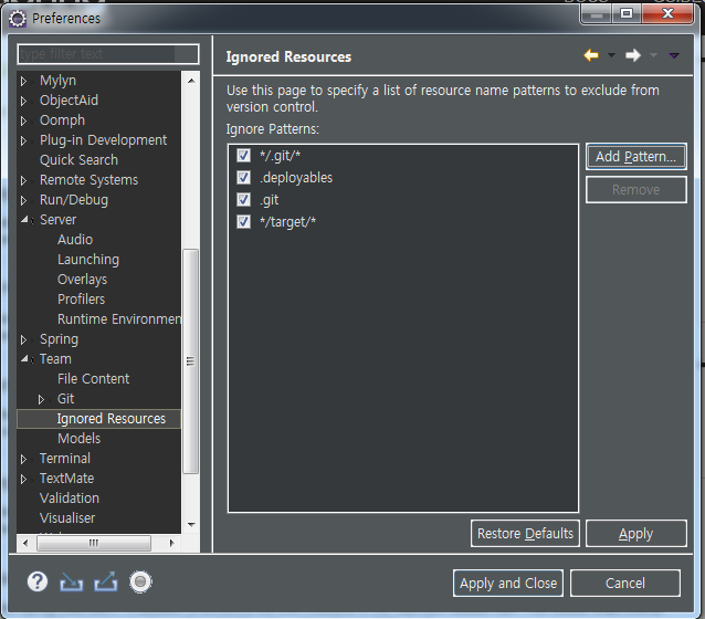 - [Window] - [Preferences] - [Team] - [Ignored Resources] -> [Add Patterns...]를 통해 */target/* 추가