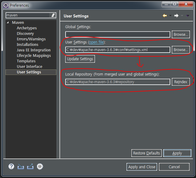 - 이클립스와 Maven 연동 -> [Window] - [Preferences] - [Maven] - [User Settings]에 접근하여 [User Settings]의 값을 conf 폴더의 settings.xml 로 변경 -> <localRepository> 폴더가 Maven으로 받은 라이브러리 저장소가 됨.