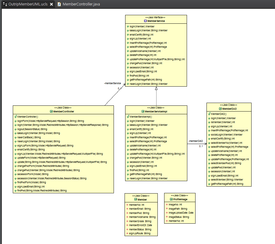 흰 백지의 화면이 나오면 잘 완성된 것인데 클래스 다이어그램에 나타내고 싶은 클래스드를 마우스로 드래그 앤 드랍해주면 알아서 들어간다. 클래스들 끼리 관계가 맺어진대로 화살표 모양이 나타난다.