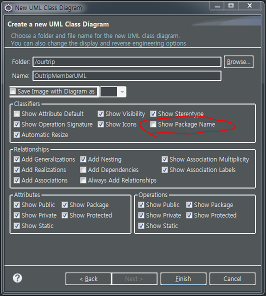 클래스에서 우클릭을 하면 [Show Attributes] 와 [Show Operations]가 있는데 Show Attributes는 클래스의 필드에 대한 설정을 할 수 있고 Show Operations는 클래스의 메소드에 대한 설정을 할 수 있다.