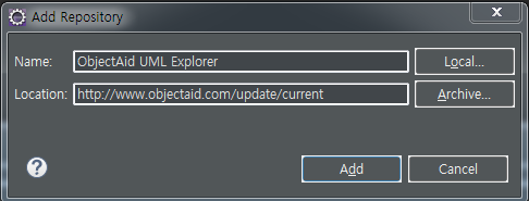 이클립스에서 [Help] - [Install New Software]를 클릭하여 Install창을 띄우고 [Add...]버튼을 클릭하여 Add Repository창을 띄운다.