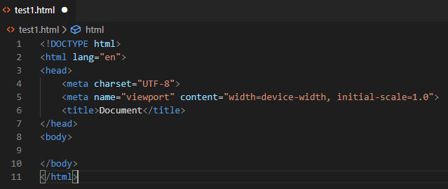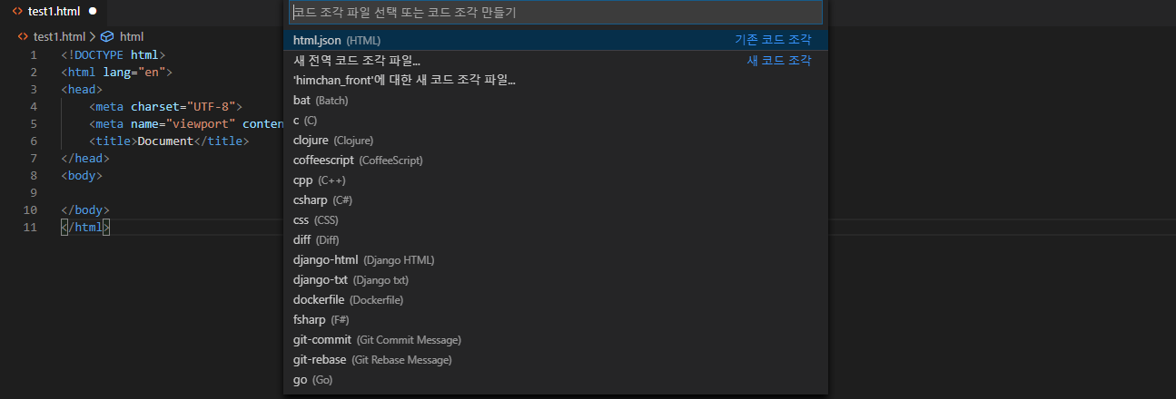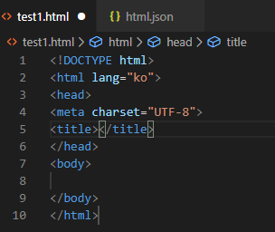 먼저 기본적으로 자동완성되는 코드를 보면 lang을 ko로 변경해야하고 viewport부분도 제거하고싶습니다. 또 title태그 내용부분이 지워져있으면 더 좋을 것 같기 때문에 위의 내용을 담은 자동완성을 만들어 보겠습니다.