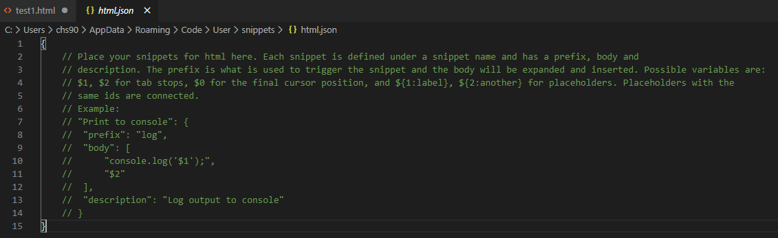 저는 코드를 더 간단하게 자동완성되게 바꿧지만 본인 스타일대로 코드조각을 수정하면 됩니다.