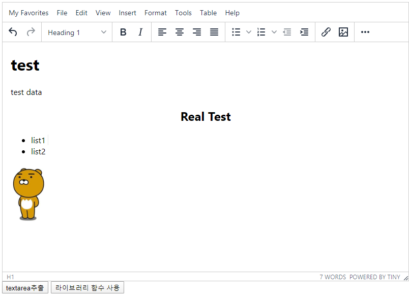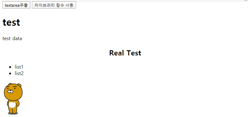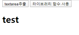 'textarea 추출' 버튼 클릭시 초기값으로 설정해둔 <h1>test</h1>값만 출력된다.